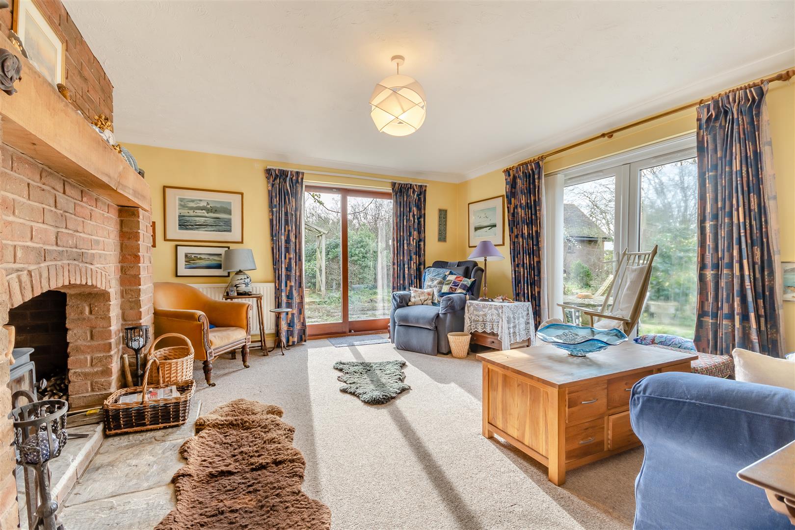 Lounge - 4.88m x 4.67m (16 x 15'4) - Large brick fireplace housing inset cast iron log burner, two radiators, built-in storage units, side aspect sliding doors and rear aspect double opening French doors to patio and gardens.