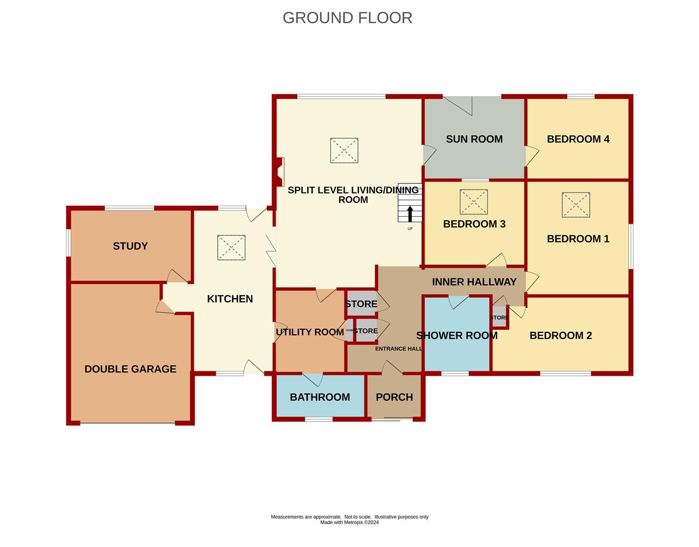 Accommodation - Upon entering the property through the porch into the entrance hallway you are greeted by a light and airy split level living/dining space which transitions nicely into the sun room leading to bedroom four. Further into the property you will find the utility room and also the first bathroom, featuring shower over bath, which flows nicely into a large kitchen space for your culinary needs. Off the Kitchen you will find one of two studies and integral access to the double garage. On the other side continuing down the inner hallway you will find three further double bedrooms and the second bathroom featuring a walk in shower.